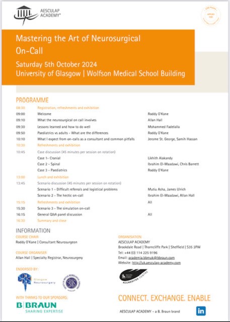 As one of the more daunting aspects of the role of a Neurosurgical Registrar, the primary aim of this course is to help to improve the ability to manage often difficult and challenging cases in a simulation environment and share your experiences with like minded colleagues to gain further understanding and additional skills to manage situations expertly.