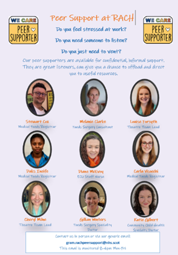 Peer support is a service which offers early emotional support to healthcare staff and is delivered by their peers who have “been there”. This is because we know that healthcare workers prefer to receive support from their peers after a stressful event at work, or if personal stressors are impacting on their work. Peer supporters undergo training to upskill themselves in delivering “psychological first aid”. This is defined as a compassionate and supportive presence designed to mitigate acute distress and assess the need for continued mental health care. Peer support is not a counselling or mentoring service. It is where a colleague has been trained to have a supportive conversation with their distressed peer, to utilise empathic listening and signpost to helpful resources or to the next level of professional help if necessary. There is currently a team of 9 trained peer supporters at RACH.