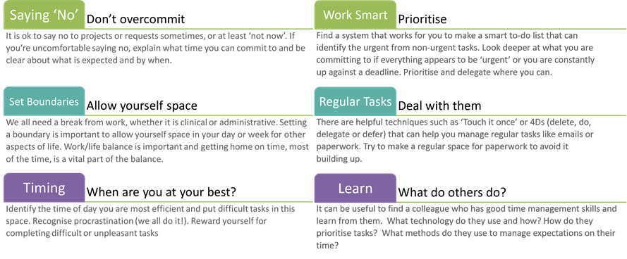 Modern technology can help you organise your time but can itself sometimes lead to stress. Learning to manage your time is an additional skill to aid your resilience and ensure you can maximise the opportunities you wish to take.